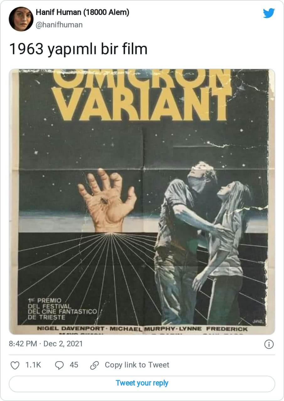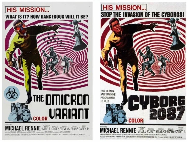 Omicron varyantının ortaya çıkmasının ardından geçmişten filmlerde öngörüldüğü sanılarak paylaşılan afiş görsellerinin bir diğeri de 1966 yapımı Cyborg 2087 adlı filmin afişi kullanılarak oluşturulmuştu.