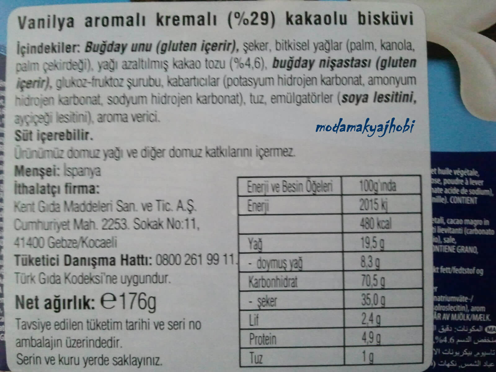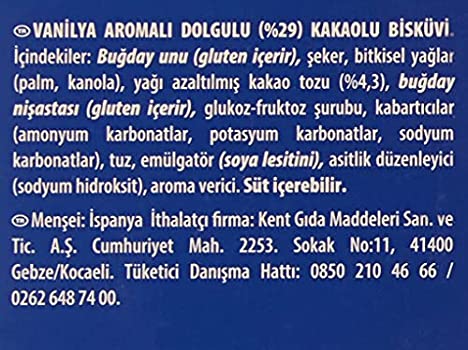 “Buğday unu (gluten içerir), şeker, bitkisel yağ (palm), yağı azaltılmış kakao tozu(%3,5), nişasta, glukoz-fruktoz şurubu, kabartıcılar (sodyum hidrojen karbonat, amonyum hidrojen karbonat), tuz, emülgatör (soya lesitini), aroma verici. Süt içerebilir.”