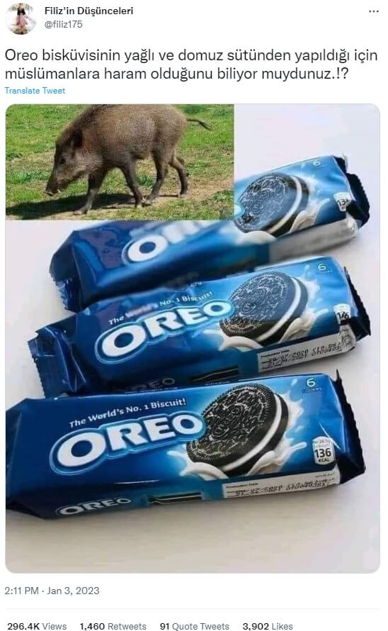 Filiz’in Düşünceleri (@filiz175): “Oreo bisküvisinin yağlı ve domuz sütünden yapıldığı için müslümanlara haram olduğunu biliyor muydunuz.!?”