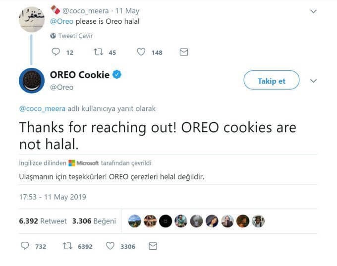 OREO’nun Twitter hesabından yapılan paylaşımlarda ABD ve Kanada’daki ürünlerin helal sertifikalı olmadığı belirtilmiş ve tercihlere göre uygunluğunu temin etmek adına içindeki malzemelerin kontrol edilmesi çağrısında bulunulmuş.
