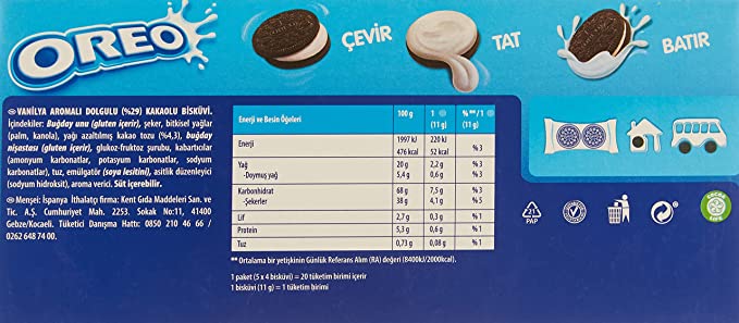 (38 gramlık) Oreo bisküvisinin paketinde aktarılan içindekiler listesi şöyle: