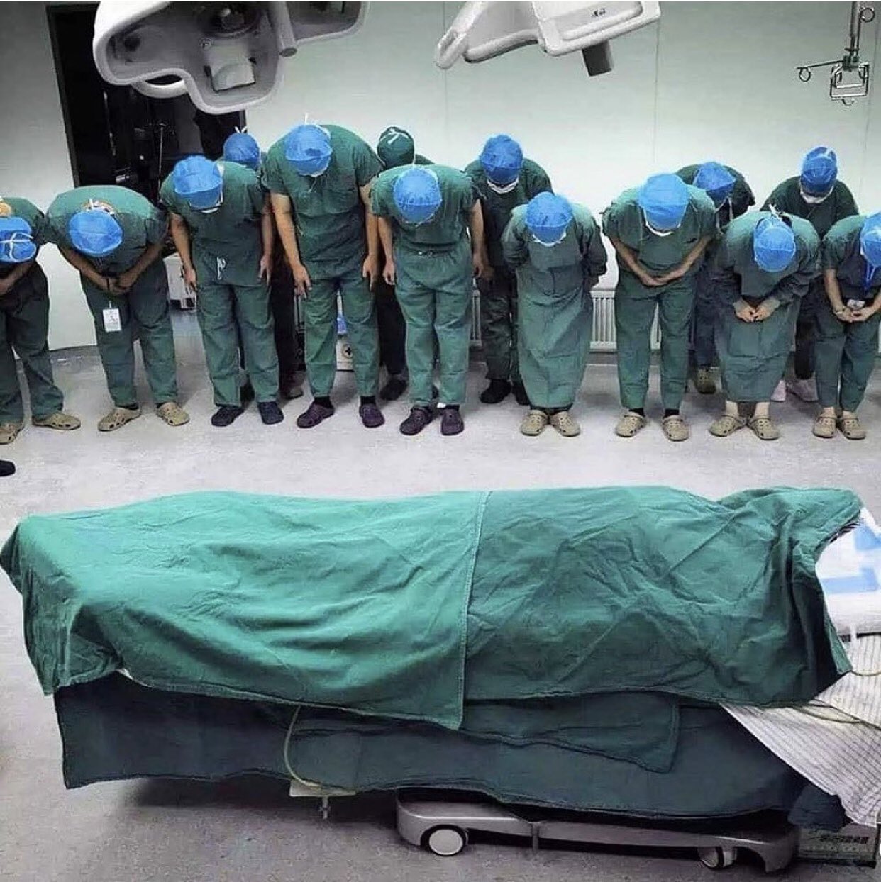 Doktorların kadavraya saygı gösterdiği bu fotoğraflar aynı kişiye ait olduğu sanılarak paylaşılıyor (Fotoğrafların Japon cerrahi ekibinin ölmeden önce organlarını bağışlayan kadavrayı operasyon öncesi selamladığı anı yansıttığı da ileri sürülüyor).