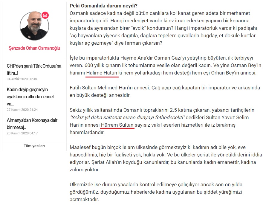 Ogünhaber’deki 27 Kasım 2020 tarihli “Kadın deyip geçmeyin ayaklarının altında cennet var!” başlıklı yazısında, Osman Gazi’nin annesi Halime Hatun’u “hanımı”, Yavuz Sultan Selim’in oğlu Kanunî Sultan Süleyman’ın eşi Hürrem Sultan’ı ise “annesi” olarak aktarmıştı: