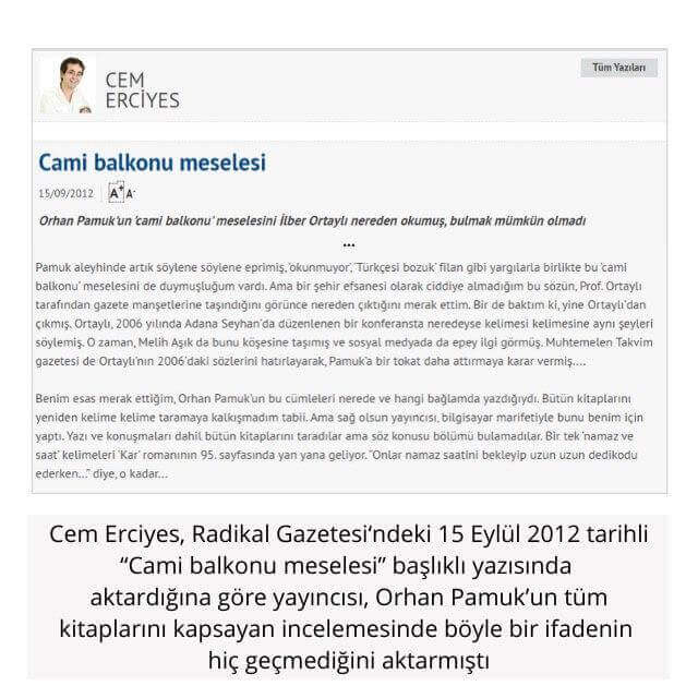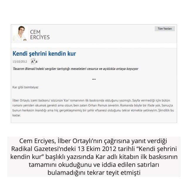 “Cem Erciyes yazıyor; “Orhan Pamuk’un ‘cami balkonu’ meselesini İlber Ortaylı nereden okumuş, bulmak mümkün olmadı”. El cevap; aziz dostum kolayından önündeki bilgisayarı karıştırmakla yetinmeyip yazı ve konuşmanın çıktığı tarihteki baskıları karıştırırsan bulursun, biraz zahmet. 2006 yılında Seyhan’daki bir konferansta soru üzerine bu sözleri söyledim. Doğrusu bu kadar yayılacağını da düşünmezdim. … “Türkiye’nin en ünlü tarihçisi de okumadığı ama bir yerlerden duyduğu bu şehir efsanesini köpürtmüş” diyor. İlk baskıya bakarsan (Kar, 2002) ancak 14. baskıda düzelttiğini bulabilirsin.”