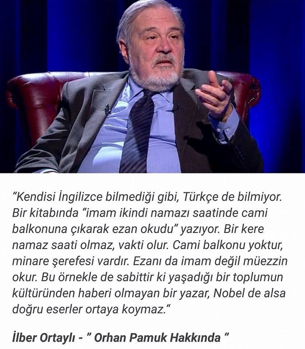 “TAKVİM’e konuşan Ortaylı, şunları söyledi: “Söz konusu kişinin kaleme aldığı bir eserde şu ifade geçiyor; ‘İmam ikindi namazı saatinde caminin balkonuna çıkarak ikindi ezanını okudu.’ Şimdi bu toplumda yaşayan her insan bilir ki, namazın saati olmaz vakti olur. Camilerde balkon diye bir yer yoktur minarenin şerefesi vardır. Ezanı da imam değil müezzin okur. Bu örnekle de sabittir ki kişiler, içinden çıktıkları toplumu bilmeden bir şeyler yapmaya çalıştıklarında doğru şeyler yapmazlar. Bana göre, Pamuk, Türkçe’yi de İngilizce’yi de bilmiyor”