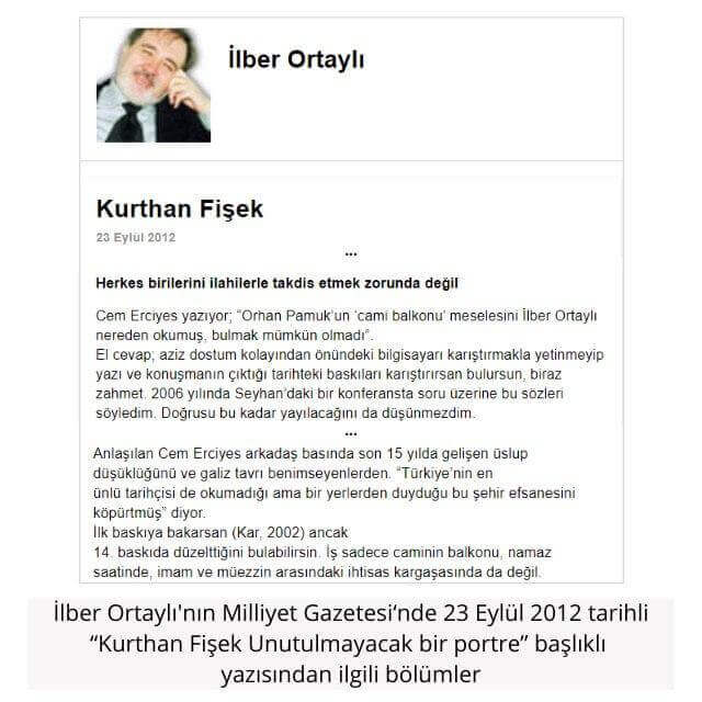 İlber Ortaylı Cem Erciyes’e cevap mahiyetinde kaleme aldığı Milliyet Gazetesi‘nde yayınlanan “Kurthan Fişek Unutulmayacak bir portre” başlıklı 23 Eylül 2012 tarihli yazısında Orhan Pamuk’un bu satırlara “Kar” kitabının 2002 yılında yayınlanan ilk baskısında yer verdiğini belirterek, sonraki baskılarda bu satırların çıkarıldığı imasında bulunmuştu: