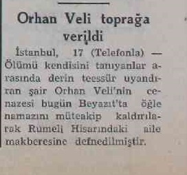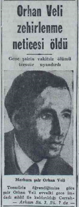 Orhan Veli, evvelki gece bir miktar ahbabının evinde fazla miktarda içki kullanmıştır. Bir müddet sonra şaire birdenbire fenalık gelmiş ve koma halinde Cerrahpaşa Hastanesine kaldırılmıştır. Orada gösterilen bütün ihtimama rağmen Orhan Veliyi kurtarmak mümkün olmamış ve şair, dün sabaha karşı hayata gözlerini yummuştur.