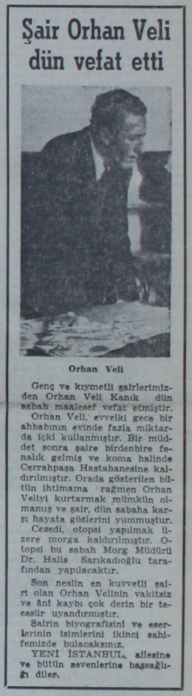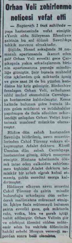 Şişlide, Hasad sokağında 36 numaralı apartımanda ikamet eden şair Orhan Veli evvelki gece Çarşıkapıda yakın arkadaşlarının birinin apartımanına yemeğe misafirliğe gitmiştir. Şair burada muhtelif cins içkilerden çok miktarda içmiş ve gece saat 24 de bu yüzden kendisine bir kriz gelmiştir. Birdenbire fenalaşan Orhan Veli, celbolunan sıhhî imdad otomobilile Cerrahpaşa hastanesine kaldırılmıştır. Koma halinde bulunan şaire burada lâzım gelen müdavat ve müdahaleler yapılmışsa da fazla alkolden zehirlendiği anlaşılan Orhan Veliyi kurtarmak maalesef mümkün olamamıştır.