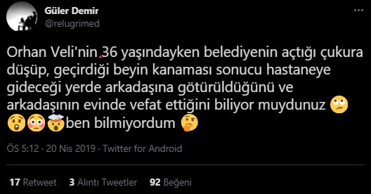 “Orhan Veli’nin 36 yaşındayken belediyenin açtığı çukura düşüp, geçirdiği beyin kanaması sonucu hastaneye gideceği yerde arkadaşına götürüldüğünü ve arkadaşının evinde vefat ettiğini biliyor muydunuz  ben bilmiyordum”