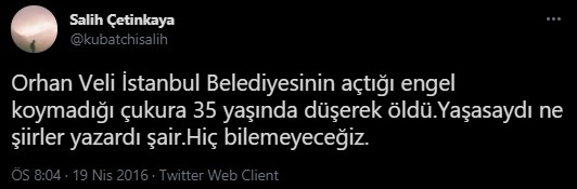 “Orhan Veli İstanbul Belediyesinin açtığı engel koymadığı çukura 35 yaşında düşerek öldü.Yaşasaydı ne şiirler yazardı şair. Hiç bilemeyeceğiz.”