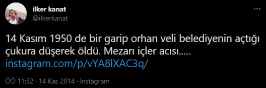 “14 Kasım 1950 de bir garip orhan veli belediyenin açtığı çukura düşerek öldü.”