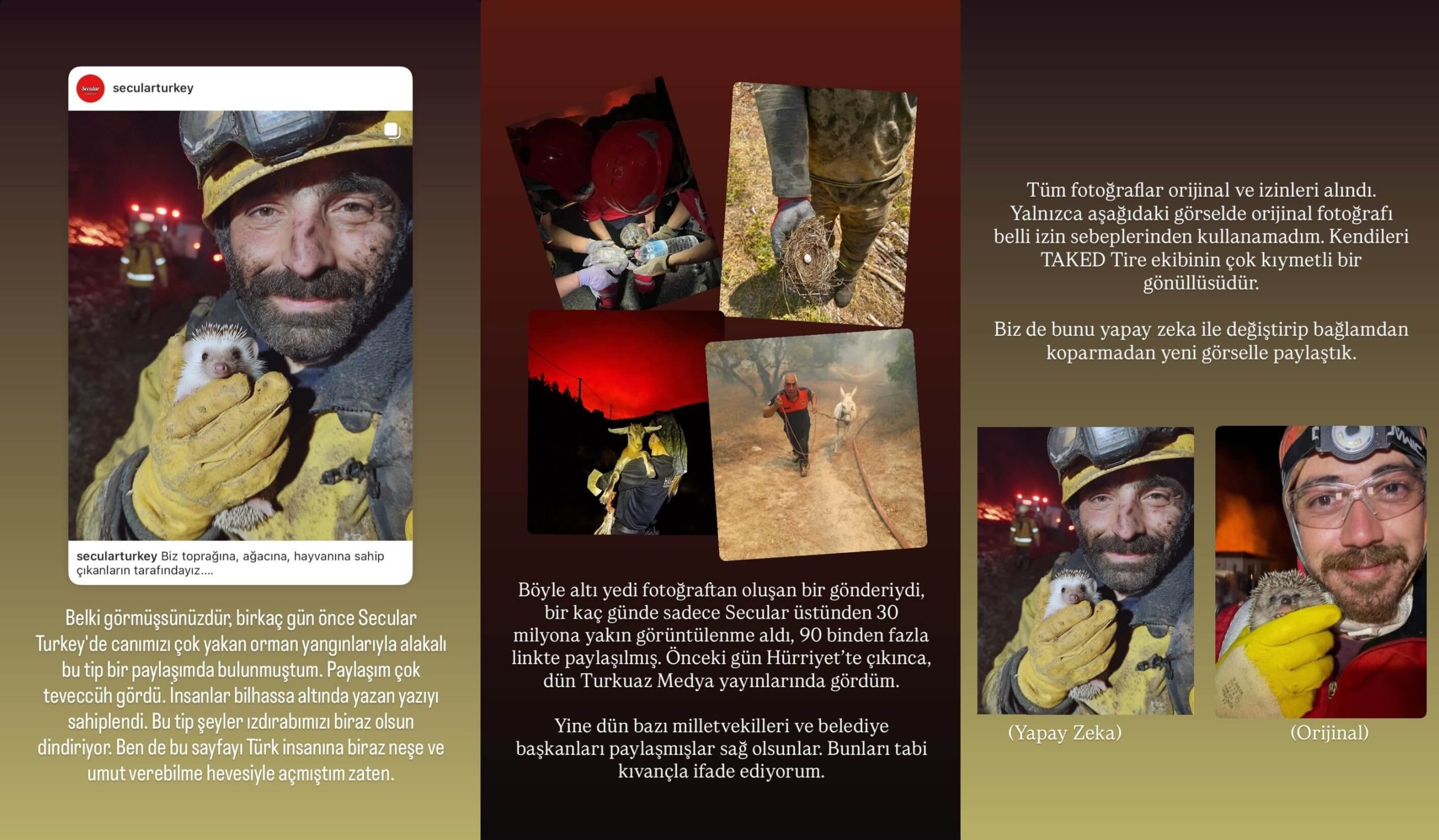 “Belki görmüşsünüzdür, birkaç gün önce Secular Turkey’ de canımızı çok yakan orman yangınlarıyla alakalı bu tip bir paylaşımda bulunmuştum. Paylaşım çok teveccüh gördü. İnsanlar bilhassa altında yazan yazıyı sahiplendi. Bu tip şeyler ızdırabımızı biraz olsun dindiriyor. Ben de bu sayfayı Türk insanına biraz neşe ve umut verebilme hevesiyle açmıştım zaten.