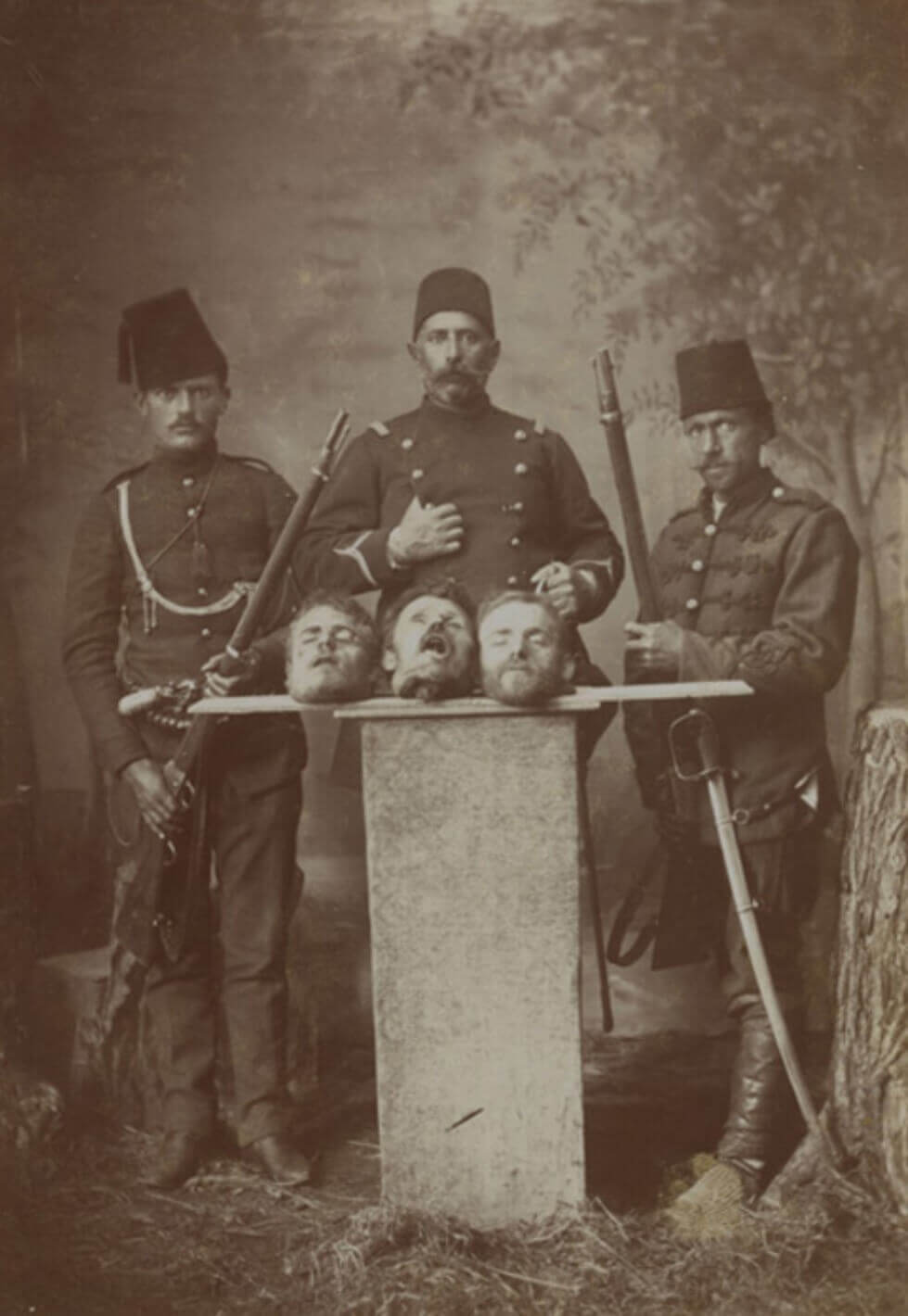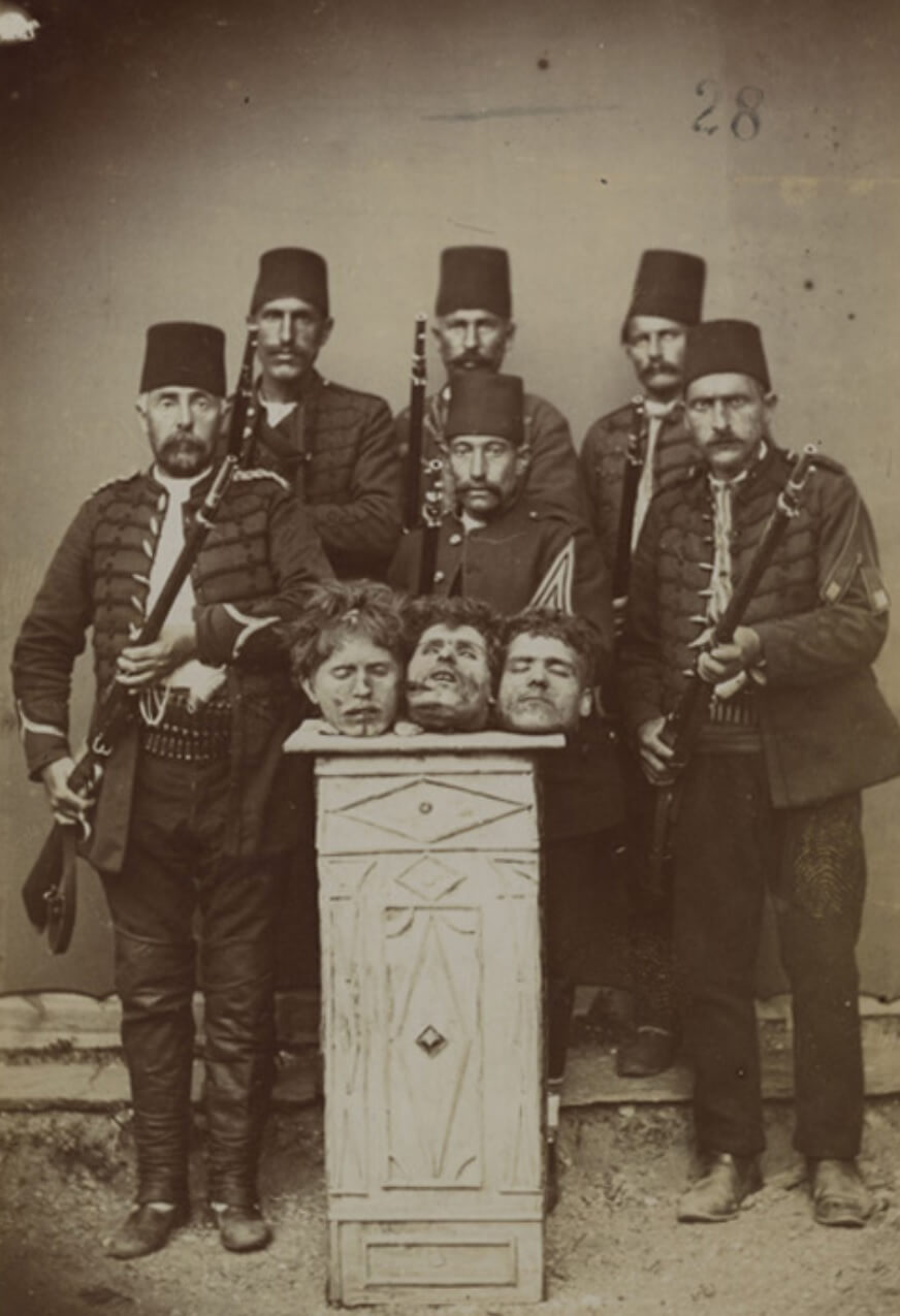 Kesik komitacı başlarıyla poz veren Osmanlı askerlerine ait olduğu iddiasıyla 1903 yılında Avrupa basınının kapaklarını süsleyen fotoğraf, Osmanlı Devleti tarafından asılsız olarak nitelenirken, kimileri görsellerin dönemin azınlıklarını Osmanlı’ya karşı kışkırtmak için hazırlanan bir komplo olduğunu öne sürerken kimileri de fotoğrafların Rumeli’nde Osmanlı’ya karşı isyan eden kişilerin cezalandırıldığı ana ait olduğunu ileri sürdü.