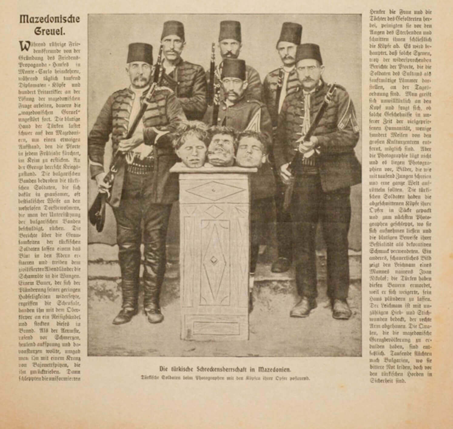 Makedonya fotoğraf stüdyolarında kesik kafalarla poz veren Osmanlı askerlerine ait olduğu öne sürülen ve Berliner Illustrirte Zeitung, L’Illustration ve La Vie Illustrée gibi yayınlarda aktarılan resimlerinin kaynağı olduğu düşünülen fotoğraf şu şekilde: