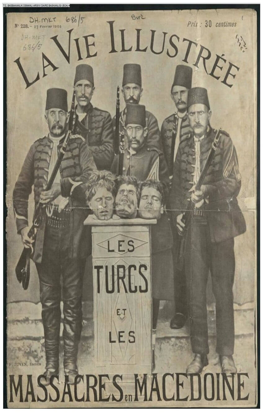La Vie Illustrée adlı yayının 27 Şubat 1903 tarihli kapağında ise “Makedonya’daki Türk mezalimi – kamera karşısında. Bir grup Türk subayı, kurbanlarının kafalarıyla fotoğrafçıya poz veriyor” notuyla bahse konu fotoğrafa yer verildiği görülüyor.