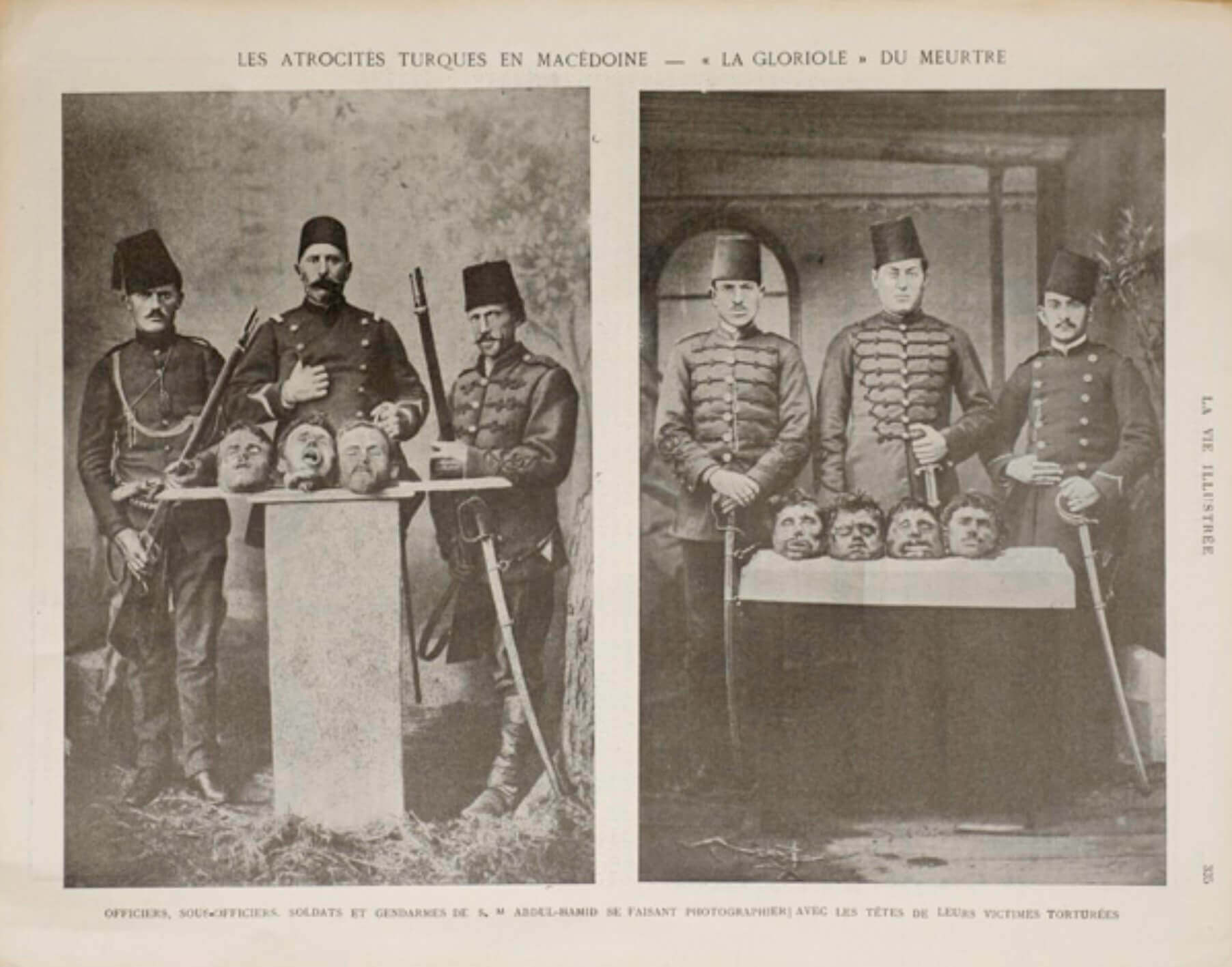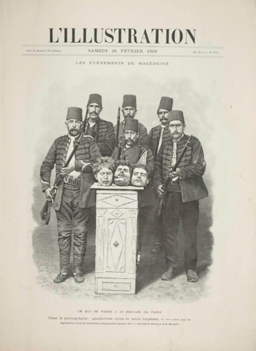 La Vie Illustrée’nin 27 Şubat 1903 tarihli sayısının iç sayfalarında “Makedonya’da Türk mezalimi – Cinayetin ‘Boş Gururu’. Majesteleri Abdülhamid’in subayları, astsubayları, askerleri ve jandarmaları işkence ettikleri kurbanlarının kafalarıyla poz verirken” notuyla benzer başka fotoğrafların aktarıldığı anlaşılmaktadır.