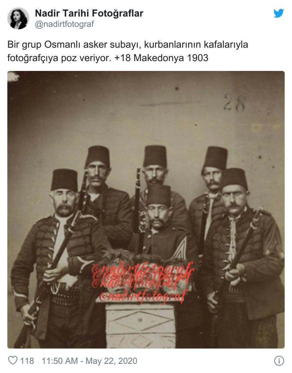 “Bir grup Osmanlı asker subayı, kurbanlarının kafalarıyla fotoğrafçıya poz veriyor. +18 Makedonya 1903” notuyla sosyal medyada paylaşılan görsel şu şekilde: