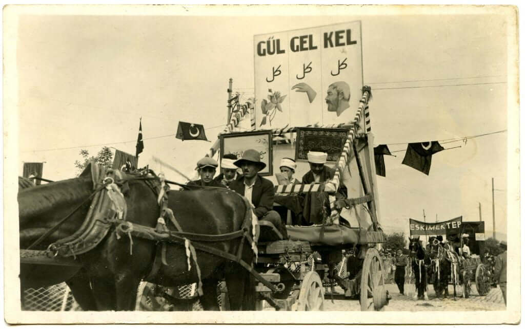 Cumhuriyetin 10. yılı kutlamalarında taşrada bir kutlama kortejinde at arabasının üzerinde taşınan eski harflerle aynı şekilde yazılan üç kelimenin yeni harflerle yazılışının resmedildiği görülen fotoğraf Harf Devrimi’nin zorunlu olduğunu ortaya koyduğu vurgusuyla paylaşılıyor.