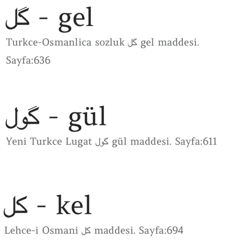 Osmanlıcada (aynı Arapça harflerin kullanıldığı) “كل : Kel گول : Gül گل : Gel” sözcüklerinin yazılışları aslında farklıdır.