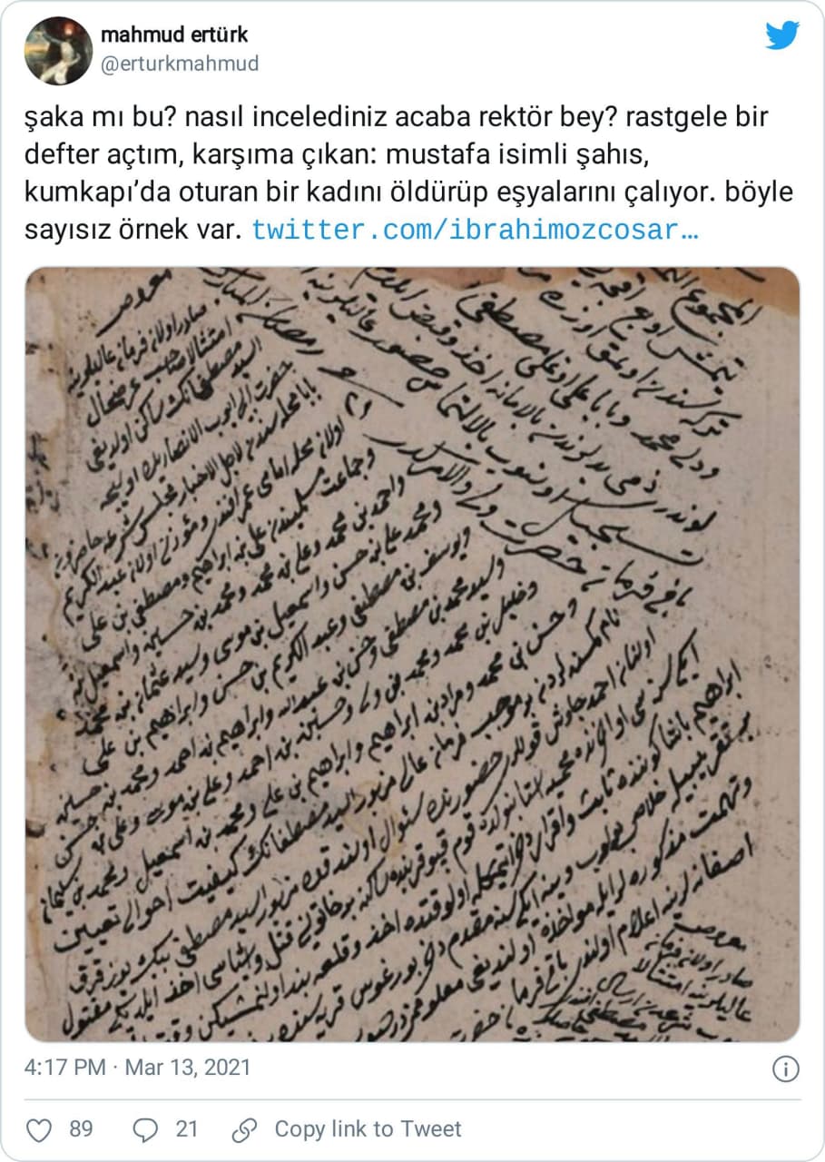 Mardin Artuklu Üniversitesi Rektörü Prof Dr. İbrahim Özcoşar, sosyal medya hesabından yaptığı bir paylaşımda Osmanlı Devleti döneminden binlerce mahkeme defterlerini incelediğini, bu şeriye sicilleri arasında bir tane bile kadın cinayetine rastlayamadığını öne sürmüştü.