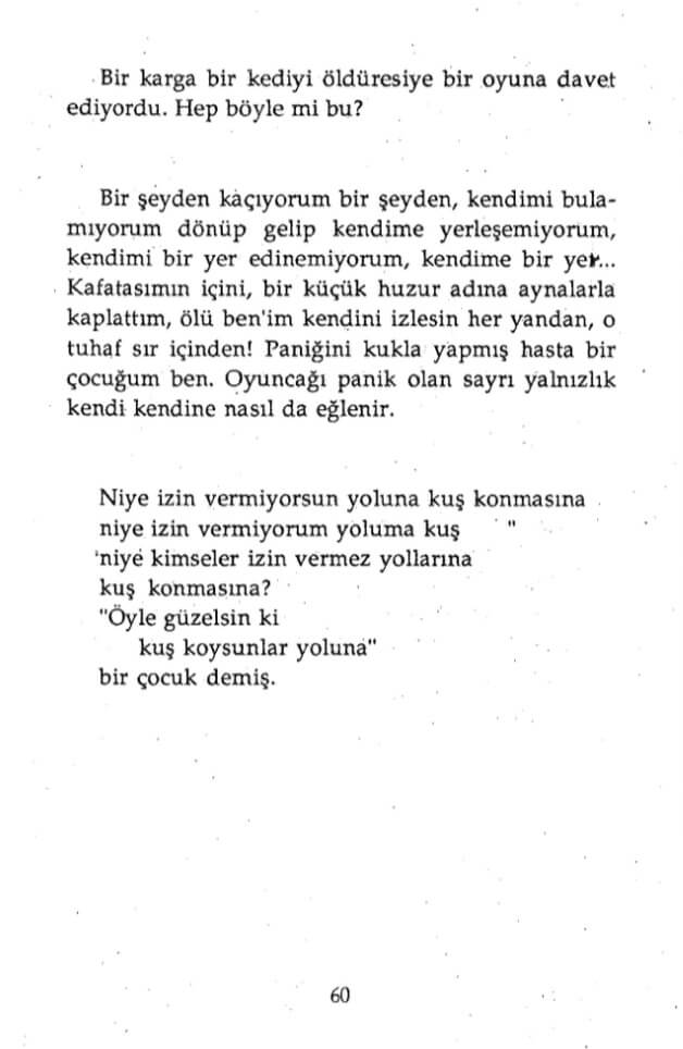 Bir şeyden kaçıyorum bir şeyden, kendimi bulamıyorum dönüp gelip kendime yerleşemiyorum, kendimi bir yer edinemiyorum, kendime bir yer…