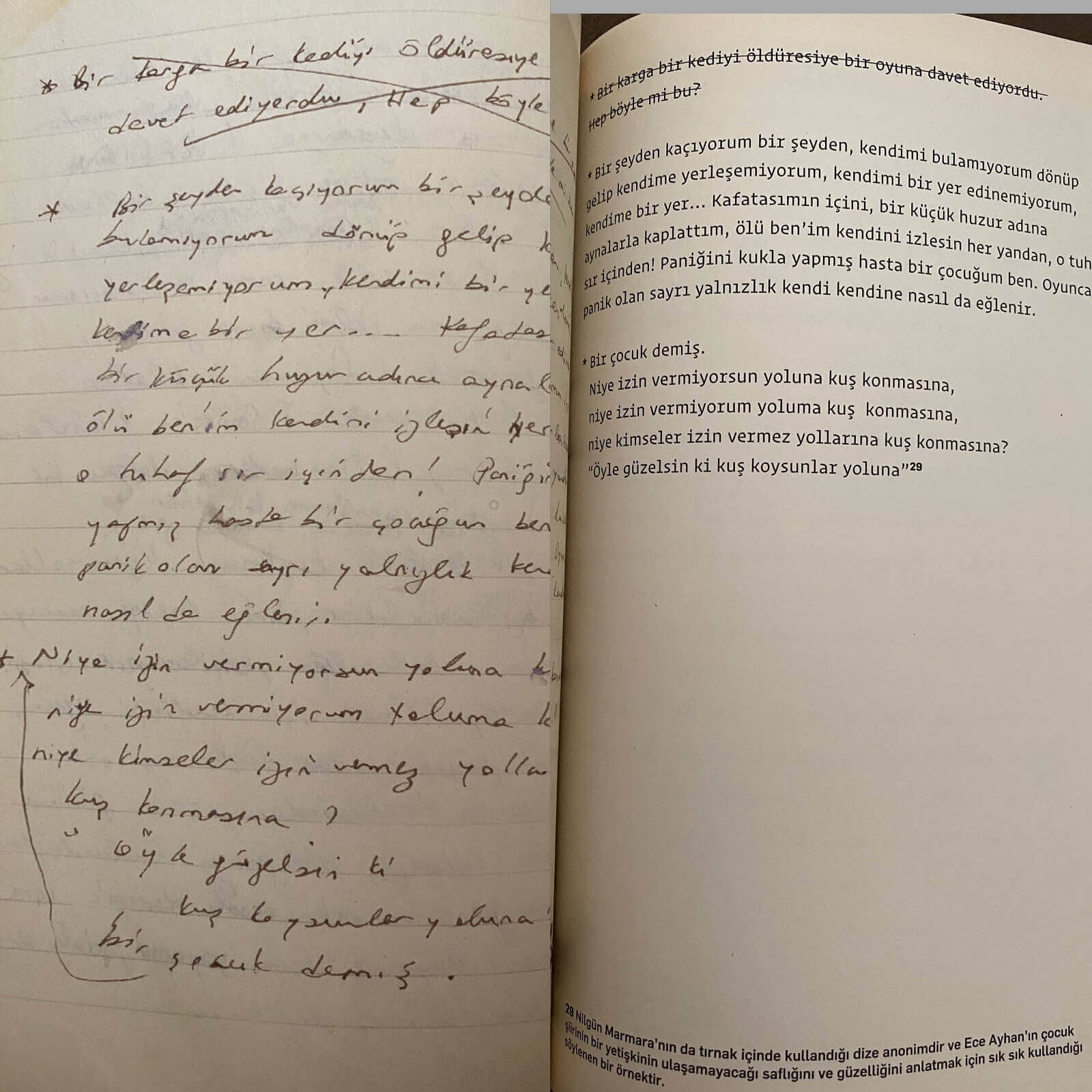 Önal’ın işaret ettiği sayfaya baktığımızda ise Nilgün Marmara’nın ilgili dizeyi tırnak içine aldığı ve altına “bir çocuk demiş” notunu düştüğünü görüyoruz. Yine bu sayfanın dipnotuna Önal tarafından şu not eklenmiştir: