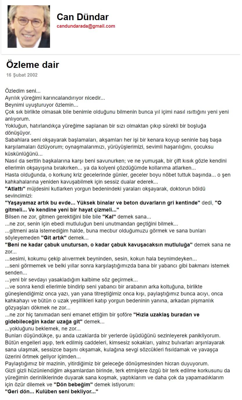 Metnin kaynağı Can Dündar’ın Milliyet’te “Özleme dair” başlığıyla 16 Şubat 2002 tarihinde yayımlanan yazısı.