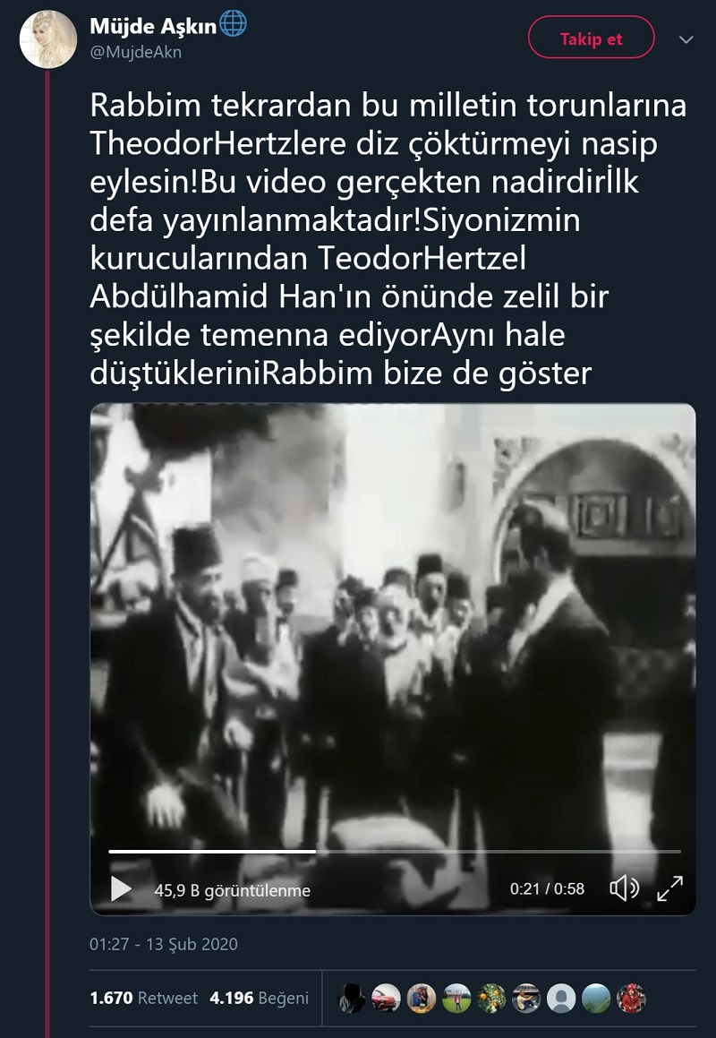Siyonizmin kurucusu Theodor Herzl’in Padişah 2. Abdulhamit’in huzurunda göründüğü ana ait olduğu iddiasıyla paylaşılan video kaydı aslında “Theodor Herzl” (Theodor Herzl, der Bannerträger des jüdischen Volkes) adlı 1921 yapımı bir siyah beyaz sinema filminden.