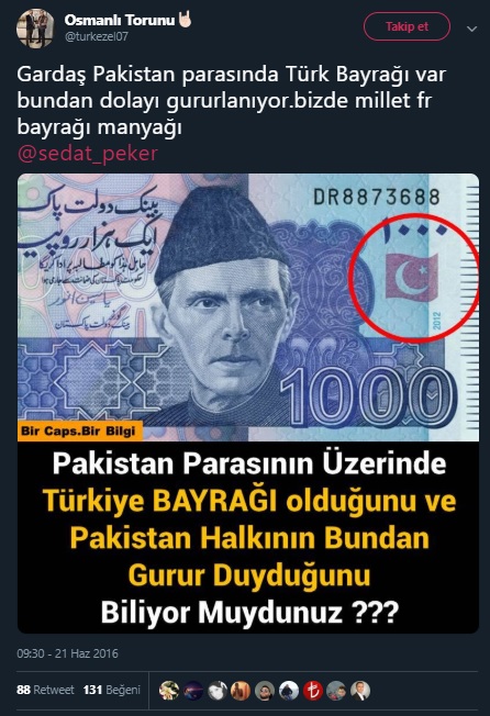 Pakistan’ın yeşil zemin üzerinde ay-yıldız içeren bayrağı, ay yıldızlı al bayrağımıza benziyor. Pakistan’da basılan 1000 rupinin üzerinde ise kırmızı zemin üzerinde ay yıldız yer alıyor. Bu durumun, Pakistan’ın parasının üzerine Türk bayrağını bastığı yönünde bir yanlış algıya yol açtığı anlaşılıyor.