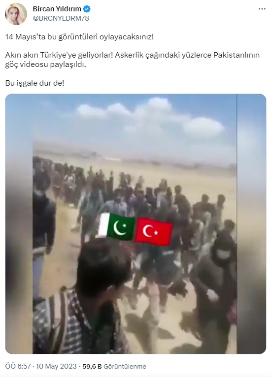 Bircan Yıldırım (@BRCNYLDRM78): “14 Mayıs’ta bu görüntüleri oylayacaksınız! Akın akın Türkiye’ye geliyorlar! Askerlik çağındaki yüzlerce Pakistanlının göç videosu paylaşıldı. Bu işgale dur de!”