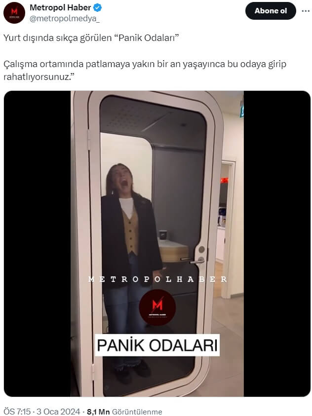 Metropol Haber (@metropolmedya_): “Yurt dışında sıkça görülen “Panik Odaları” Çalışma ortamında patlamaya yakın bir an yaşayınca bu odaya girip rahatlıyorsunuz.””