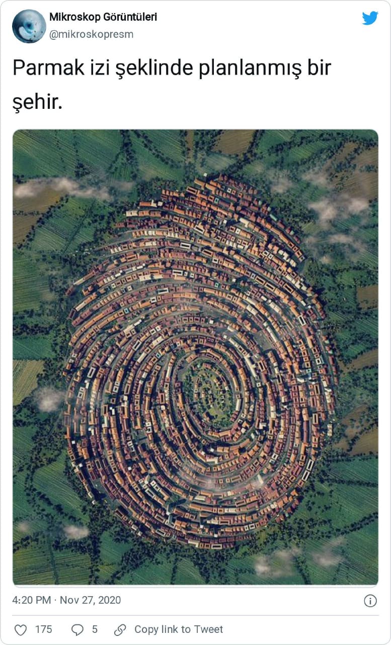 Kentin düzenlemesini sevgilisinin parmak izi şeklinde yapan mimarın eseriymiş. (İnternette Almanya’da bir kasaba şeklide geçiyor ama burayı bulamadım. Photoshop olma ihtimali yüksek ama düşünmesi bile güzel)
