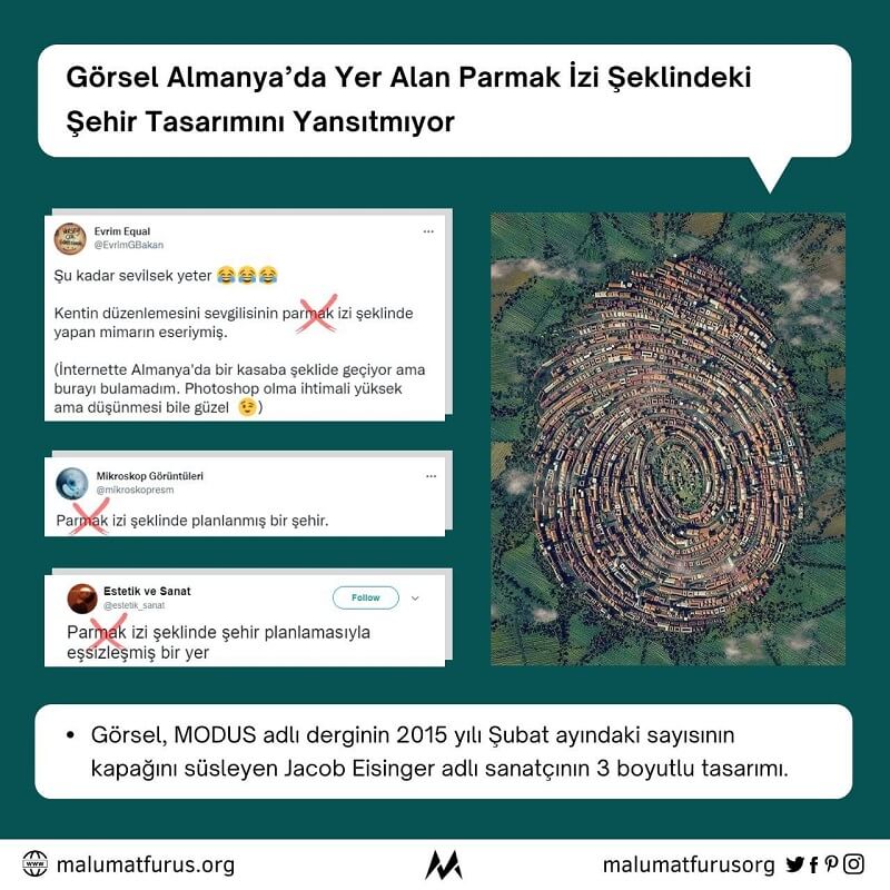 Bazı sosyal medya kullanıcıları tarafından Almanya’dan bir kentin havadan parmak izine benzeyen havadan görüntüsü sanılan görsel aslında ne Almanya’dan gerçek bir fotoğraf ne de gerçekte var olan bir şehrin görsel tasviri; sadece, MODUS adlı derginin 2015 yılı Şubat ayındaki sayısının kapağını süsleyen Jacob Eisinger adlı sanatçının 3 boyutlu tasarımı.