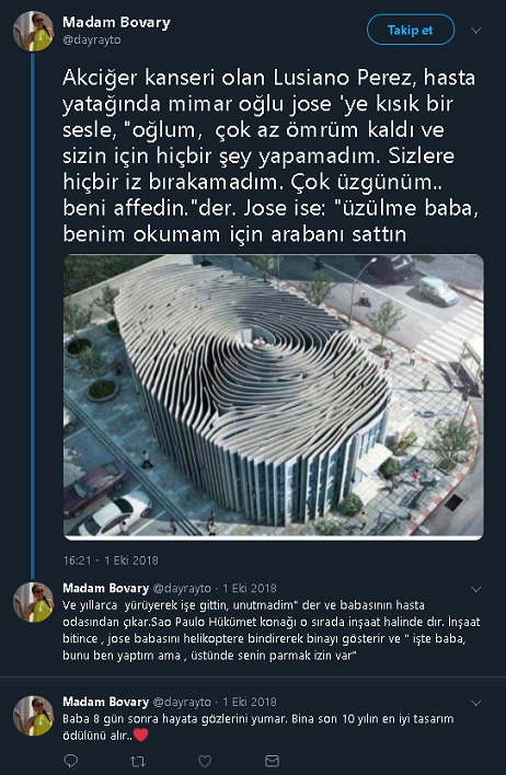 Jose ise; ‘Üzülme baba. Benim okumam için arabanı sattın. Yıllarca yürüyerek işe gittin. Bunu unutmadım’ der ve çıkar. Sao Paulo Hükümet konağı o sırada inşaat halindedir, inşaat bitince babasını helikoptere bindirerek binayı gösterir ve; “işte baba bunu ben yaptım ama üstünde senin parmak izin var” der… (Baba 8 gün sonra hayata gözlerini yumar, Bina son 10 yılın en iyi tasarım ödülünü alır…)”