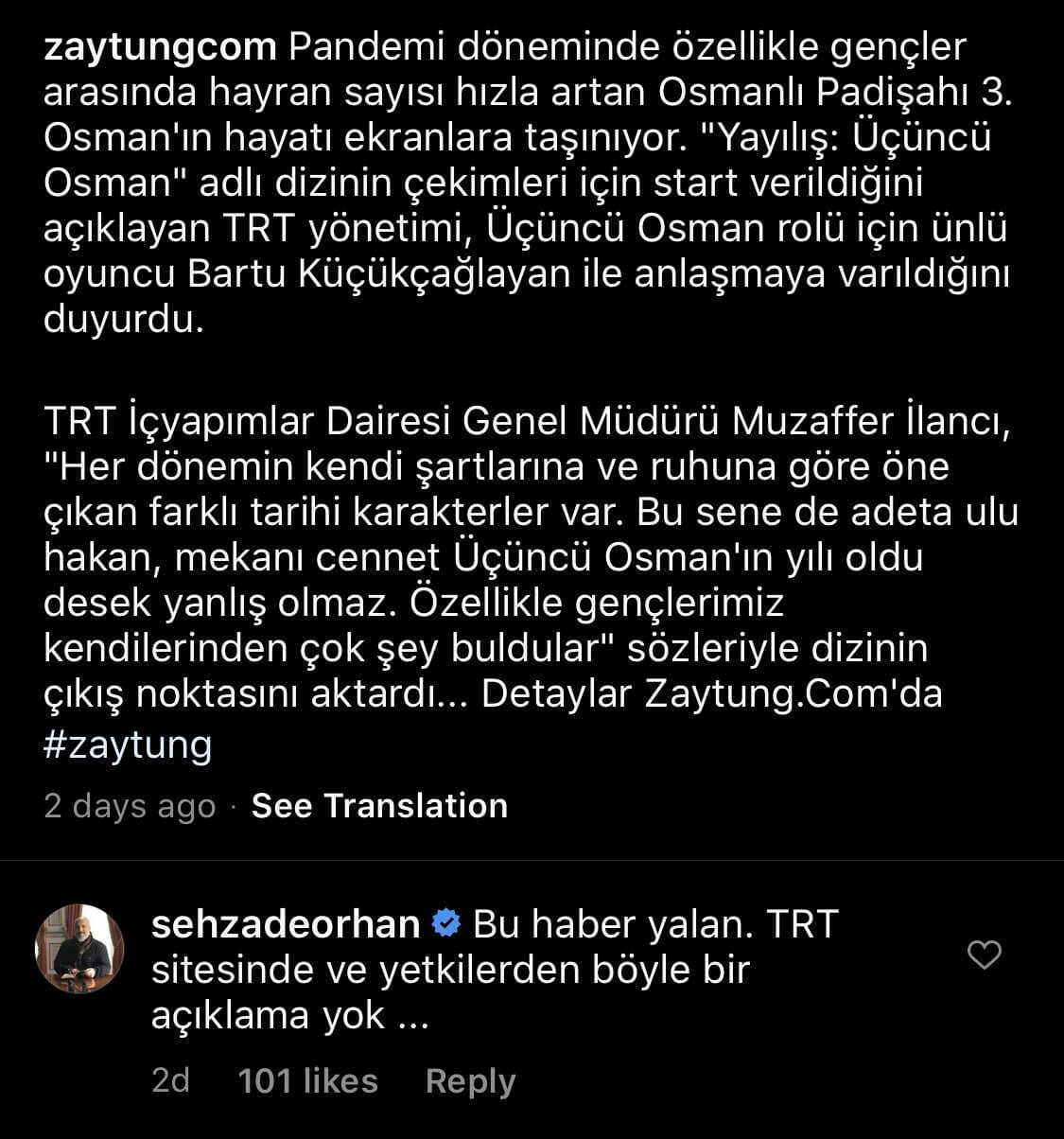 Çeşitli haber sitelerinde köşe yazıları yayımlanan Orhan Osmanoğlu, Zaytung’un “Yayılış: 3. Osman” dizisi konulu “parodi” paylaşımını gerçek sanmıştı.