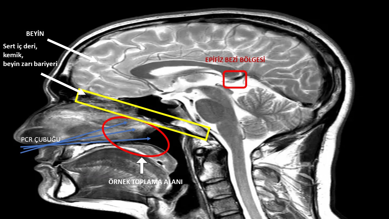 Görselde epifiz bezi (pineal gland) ve diğer birkaç beyin yapısı görülmektedir. Görüldüğü gibi epifiz bezinin yerleşimi oldukça uzaktadır; burun girişleri ile arasında çok uzak bir mesafe ve arada atlatılamayacak kadar çok sayıda yapı vardır. Sürüntü çubuğu, yutağa daha yakın olan hipofiz bezi (pituitary gland) gibi diğer yapılara kadar bile gitmemektedir, çok daha yukarıda ve uzakta olan epifiz bezine yetişmesi imkânsızdır.