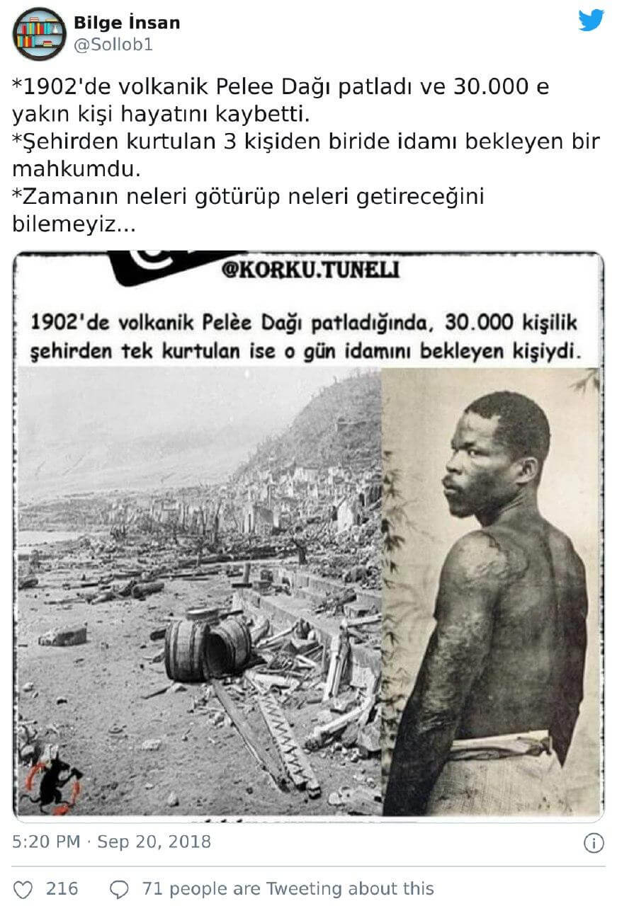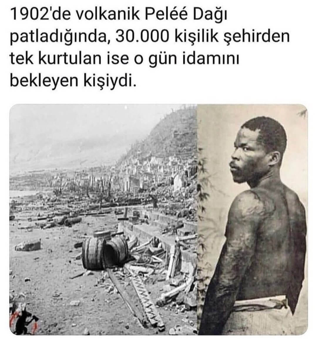 “1902’de volkanik Pelee Dağı patladı ve 30.000 e yakın kişi hayatını kaybetti. *Şehirden kurtulan 3 kişiden biride idamı bekleyen bir mahkumdu.”