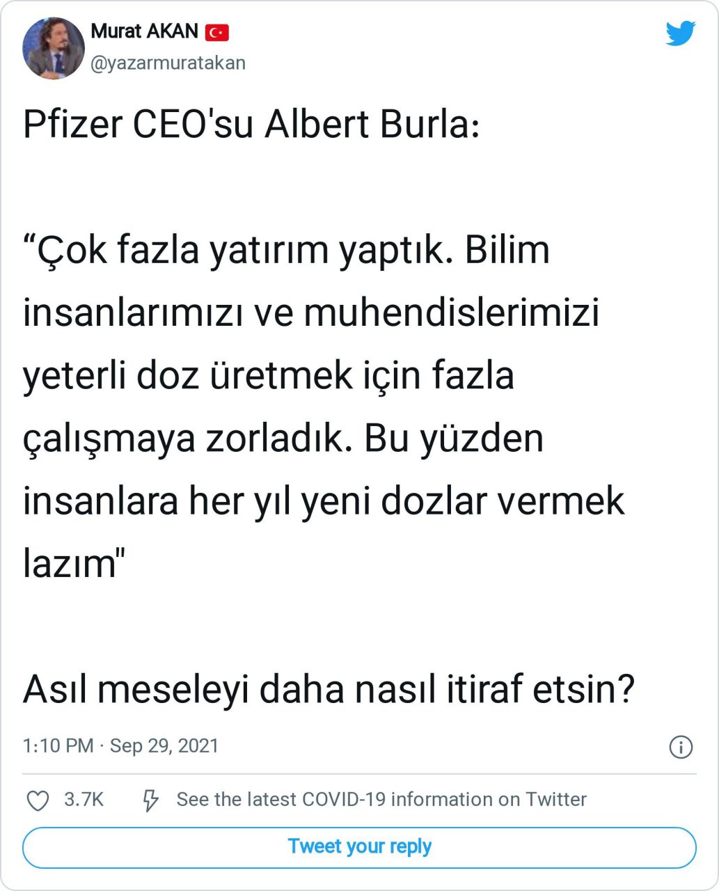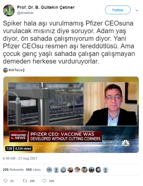 “Spiker hala aşı vurulmamış Pfizer CEOsuna vurulacak mısınız diye soruyor. Adam yaş diyor, ön sahada çalışmıyorum diyor. Yani Pfizer CEOsu resmen aşı tereddütlüsü. Ama çocuk genç yaşlı sahada çalışan çalışmayan demeden herkese vurduruyorlar.”