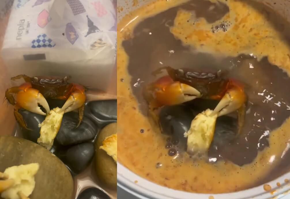 Tencerede Pişerken Ekmek Yemeye Devam Eden Yengecin Görüldüğü Video Dijital Müdahale İçeriyor