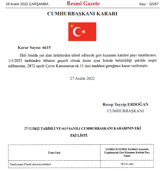 28 Aralık 2022 günkü kafa karışıklığı, geri kazanım katılım payı kapsamında marketlerin piyasaya süreceği poşetler için devlete ödemesi gereken tutara dair Resmî Gazete’de yayımlanan Cumhurbaşkanlığı Kararının yanlış yorumlanmasıyla oluşmuş.