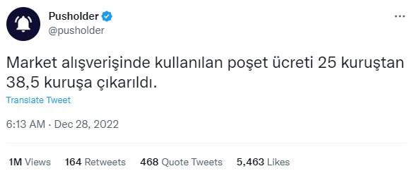 Pusholder: “Market alışverişinde kullanılan poşet ücreti 25 kuruştan 38,5 kuruşa çıkarıldı.”