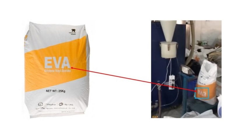 Plastik imalat şirketindeki plastik granülasyon sürecine ait görüntü dikkatli izlendiğinde üzerinde (Hanwha Total Petrochemical Company Limited adlı Güney Koreli firmanın) Ethylene Vinyl Acetate (EVA) yazılı (farklı e-ticaret sitelerinde satışa sunulan) plastik granül dolu torbaların yer aldığı görülüyor.
