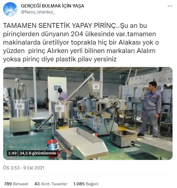 Ekstruder makineleri ile granül plastik üretimine, plastik geri dönüşümüne ya da farklı besin maddeleriyle pirinç üretimine ait videoların sıklıkla plastikten sahte pirinç üretimini yansıttığı iddiasıyla paylaşıldığı görülüyor.