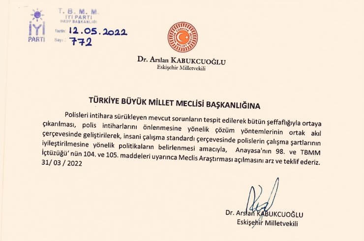 Polisleri intihara sürükleyen sebeplerin araştırılarak alınması gereken tedbirlerin belirlenmesi amacıyla bir Meclis araştırması açılmasına ilişkin meclis araştırma önergesi 12 Mayıs 2022 tarihinde İYİ Parti Eskişehir Milletvekili Arslan Kabukcuoğlu ve diğer 19 İYİ Parti milletvekili tarafından Türkiye Büyük Millet Meclisi’ne (TBMM) sunulmuştu.