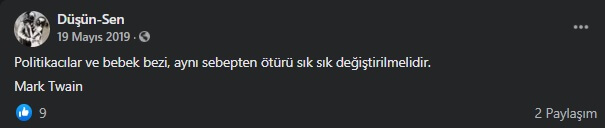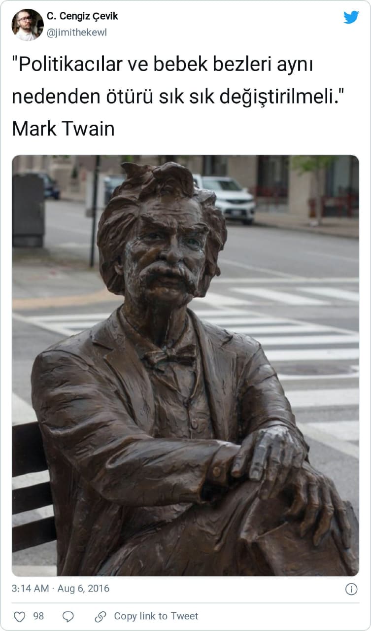 Daha önce, ABD’li yazar Mark Twain’e (1835-1910) yanlışlıkla atfedilen “Eğer oy vermek bir şeyi değiştirseydi oy vermemize izin vermezlerdi”, “Gerçek, ayakkabılarını giymeden yalan, dünyayı 3 kez dolaşır”, “Gemi, limanda güvendedir; ama gemiler bunun için yapılmamıştır” ve “Asla bir domuzla güreşme, ikiniz de kirlenirsiniz ama bu sadece domuzun hoşuna gider” gibi vecizelere değinmiştik. Bugünkü konumuz, sahipliği yine Twain’e hatalı biçimde izafe edilen “Politikacılar ve bebek bezleri aynı nedenden ötürü sık sık değiştirilmeli” (“Politicians are like diapers; they need to be changed often and for the same reason“) sözü.