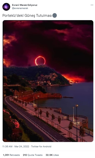Aşağıdaki görselin Portekiz’de gözlemlenen tam Güneş tutulmasına ait olduğu iddiasıyla paylaşıldığı görülüyor.