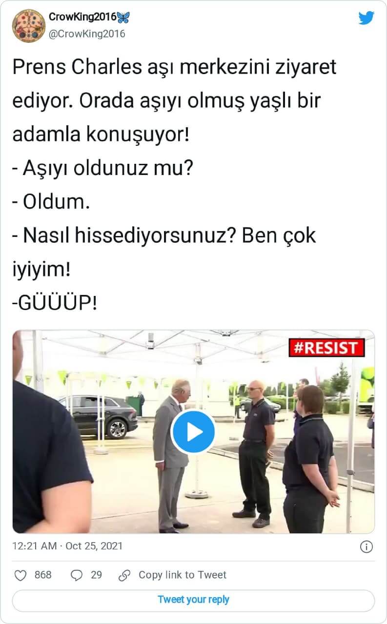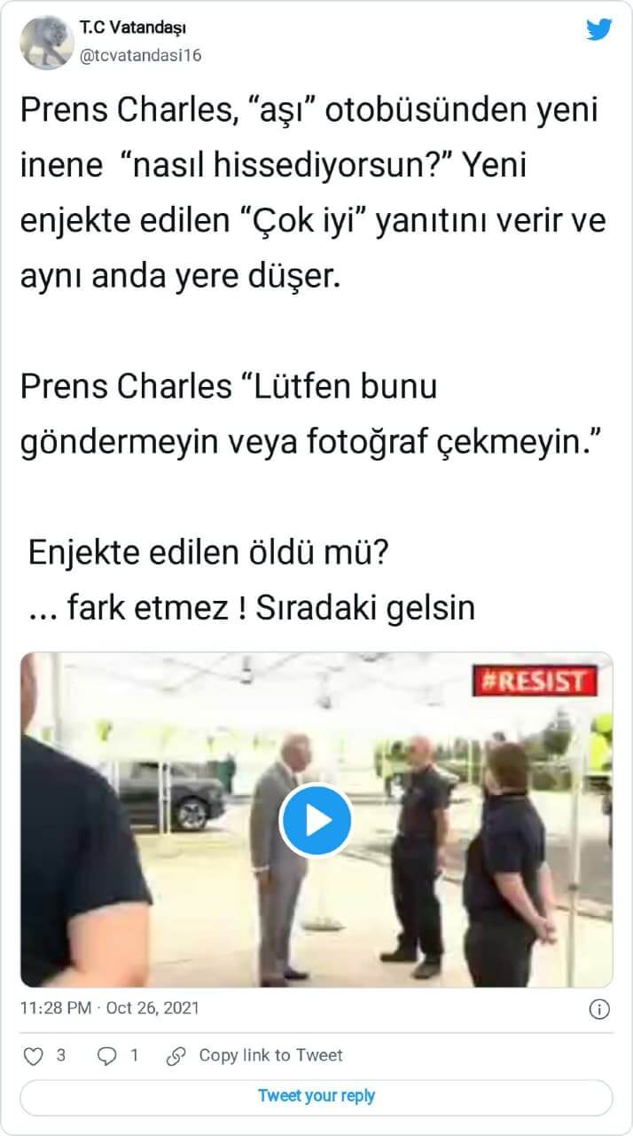 “Prens Charles, “aşı” otobüsünden yeni inene “nasıl hissediyorsun?” Yeni enjekte edilen “Çok iyi” yanıtını verir ve aynı anda yere düşer. Prens Charles “Lütfen bunu göndermeyin veya fotoğraf çekmeyin.” Enjekte edilen öldü mü? … fark etmez ! Sıradaki gelsin”