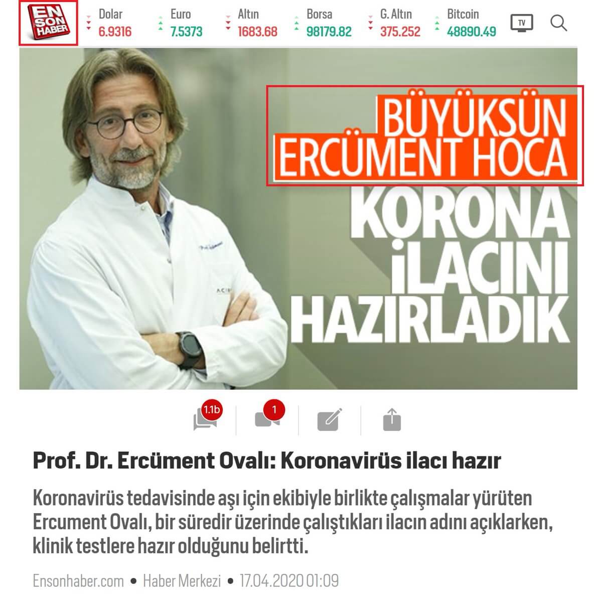 Hâl böyle iken yaşanan süreçte çevrim içi haber platformları ve sosyal medyaya hematoloji uzmanı Prof. Dr. Ercüment Ovalı’nın koronavirüs ilacını / aşısını bulduğuna yönelik iddiayı içeren haberler ve paylaşımlar yansımaya başladı.