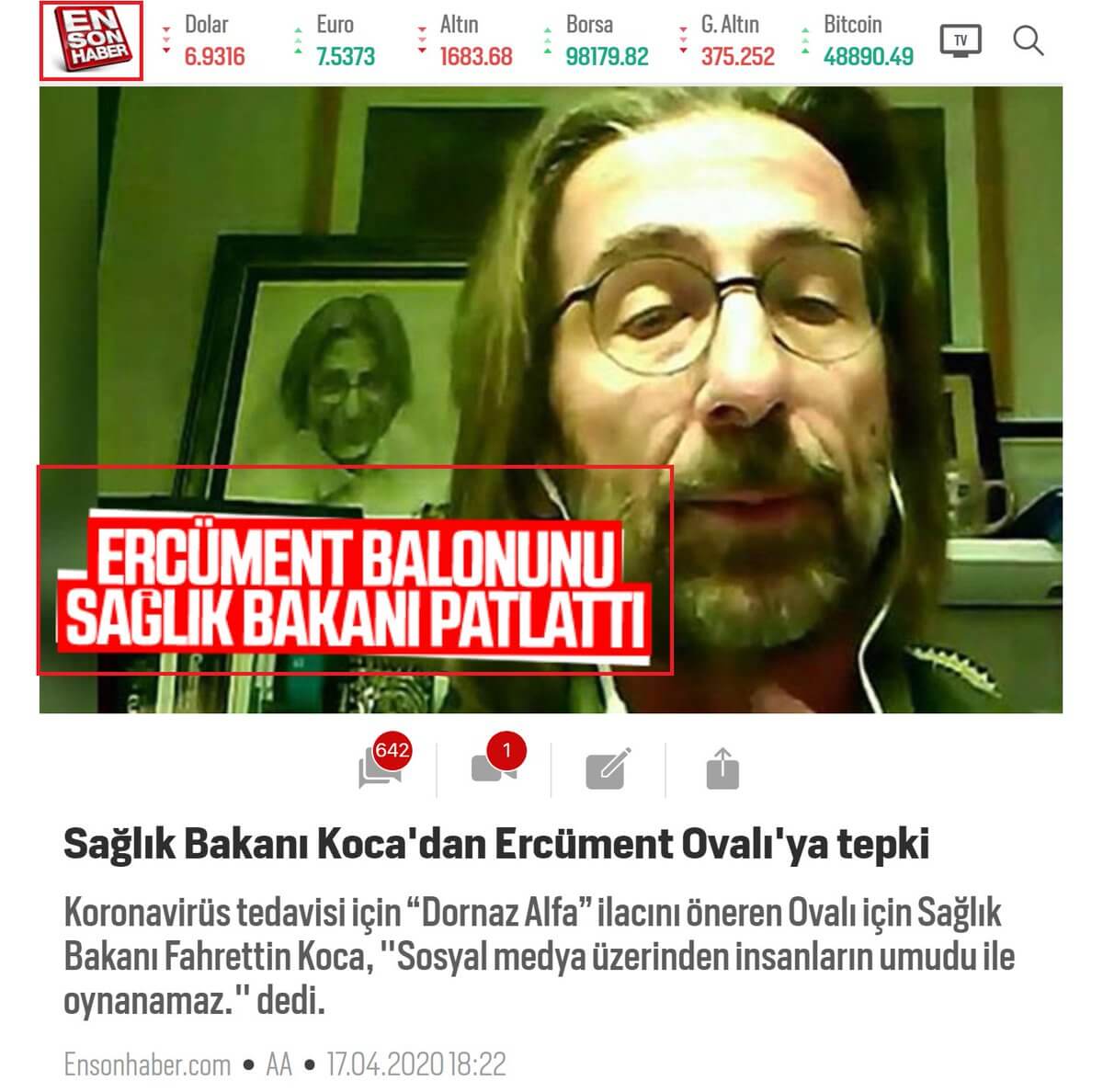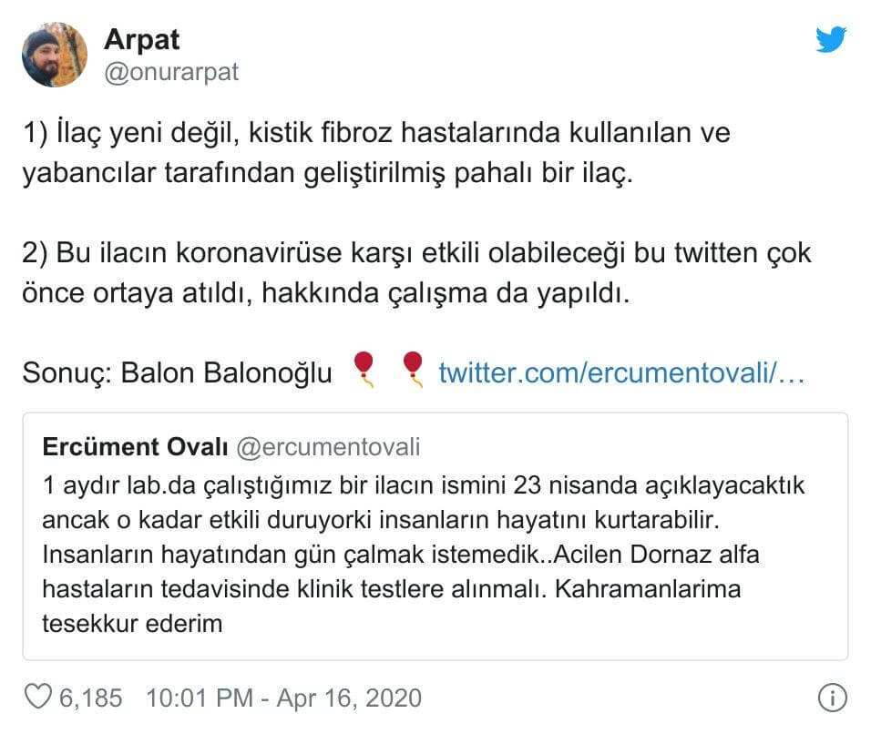 Ovalı, “Bu müjdeyi aslında Tübitak’ in düzenlediği konuşmamda ilacin ismini vermeden soylemistim.. Youtube da izlerseniz göreceksiniz” sözleriyle günlerdir vatandaşların beklediği müjdeyi açıkladığını belirtmişti. Ancak dornaz alfa uzmanların ve ilgililerin yabancısı olmadığı, koronavirüs salgını ile mücadelede müjde sayılamayacak bir ilaçtı.