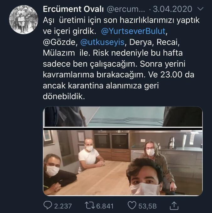 “Aşı üretimi için son hazırlıklarımızı yaptık ve içeri girdik. @YurtseverBulut, @Gözde, @utkuseyis, Derya, Recai, Mülazım ile. Risk nedeniyle bu hafta sadece ben çalışacağım. Sonra yerini kavramlarıma bırakacağım. Ve 23.00 da ancak karantina alanımıza geri dönebildik.”